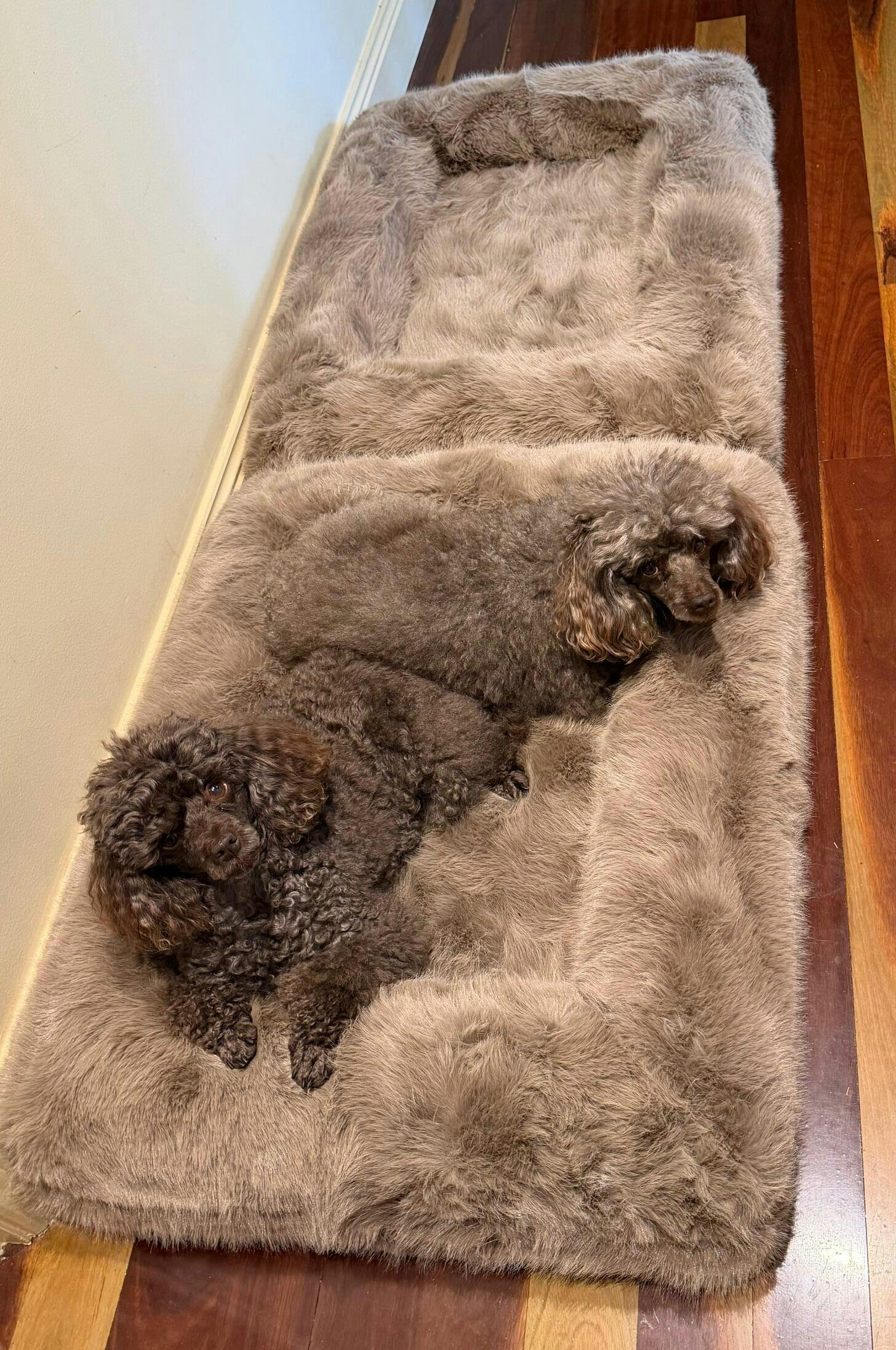 Thank you so much for sharing this! It’s lovely to see how much your adorable toy poodles are enjoying their Barney Beds. We don't blame them for wanting to snuggle in the fur We appreciate the feedback around a longer size and will be passing this along to our team