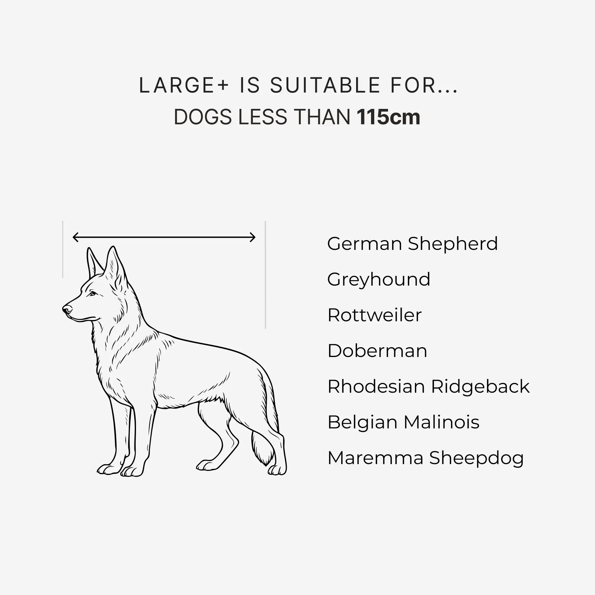 The newest addition to the Barney Bed range, the Large+ is designed for dogs that fall between our Large and XL sizes. Perfect for breeds such as German Shepherds, Greyhounds, Rhodesian Ridgebacks, Dobermans, Rottweilers, or big Golden Retrievers, this size gives them the extra room they need without stepping up to an XL.